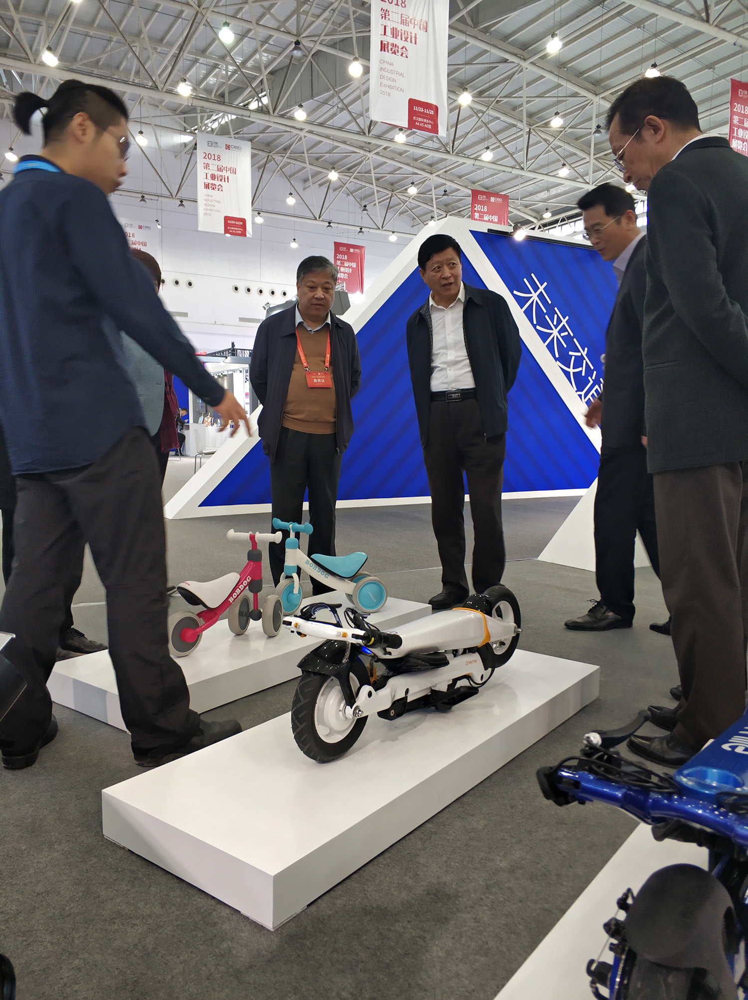 岸峰設(shè)計(jì)師為領(lǐng)導(dǎo)們講解榮獲“紅點(diǎn)之星”大獎的光環(huán)電動折疊車
